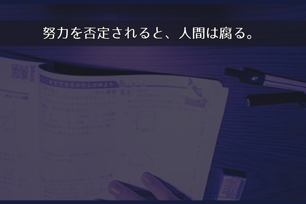 努力を否定されると、その人は壊れます。(ここで「成果ではなく過程を褒めろ→成果の有無に価値はない」は、余りにも極論であることを注記しておきます)
